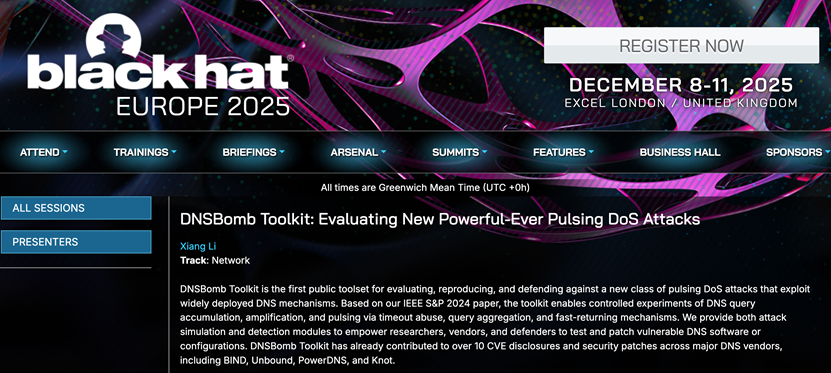 Black Hat是全球最具影响力的工业界信息安全会议之一,长期聚焦前沿攻防技术与最新安全威胁。我院李想副教授课题组论文 “DNSBomb Toolkit: Evaluating New Powerful-Ever Pulsing DoS Attacks” 入选Black Hat Europe 2025 Arsenal,该成果最初发表于顶级会议IEEE S&P 2024。本次录用也是李想副教授自2023年以来连续第三年在Black Hat发表的第五次演讲。